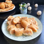 Тесто поделить на 3 части и каждую раскатать жгутом (у меня получилась длина 24см). Каждый жгут порезать на кусочки (~ по 2см).