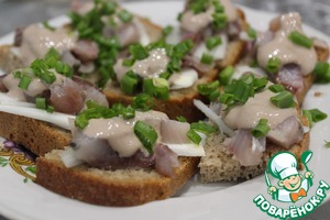 Вариант немедленной подачи. Собрать канапе. На кусочек ржаного хлеба выложить репчатый лук, нарезанный полукольцами, кусочек филе сельди, ложечка соуса. Посыпать мелко нарезанным зеленым луком.