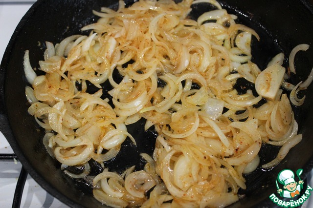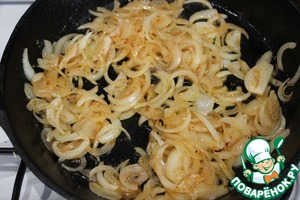 • Репчатый лук, нарезанный полукольцами, обжарить до прозрачного состояния на другой сковороде. Я все жарю одновременно.