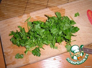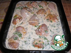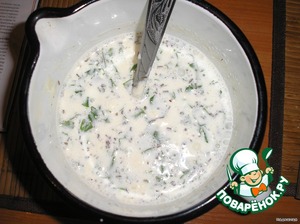 И готовим соус: сметану и молоко смешиваем, чуть подсолить и приправить специями. Добавляем измельченную зелень.