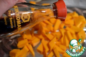 Выложить на фольгу, полить соевым соусом. У меня натурально сваренный соевый соус ТМ Kikkomаn. Запекать в разогретой до 200 градусов духовке около 15 минут.