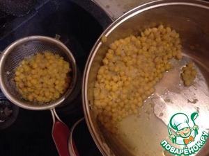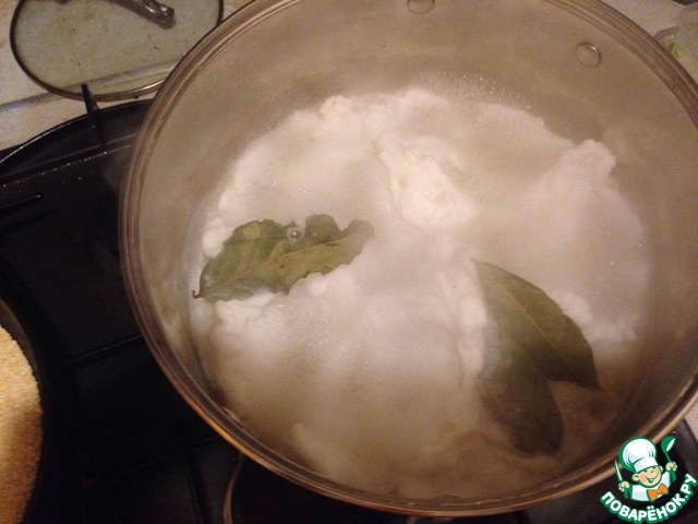 • Ставим нут на огонь, добавив соду и лавровый лист. Варим до мягкости, снимая пену. Под мягкостью я понимаю следующее: если взять горошину пальцами, она должна легко раздавиться в пюреобразную пассу, но не переваривайте до состояния, когда уже в в процессе варки нут теряет форму.