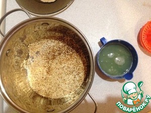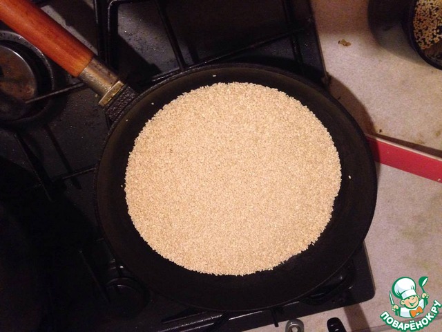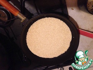 • Кунжут выкладываем на разогретую на небольшом огне сковородку, и обжариваем до легкого золотистого цвета и характерного запаха, потряхивая рукой сковородку во избежание пригорания. в общей сложности - минут 5, с потряхиванием раз в секунд 20