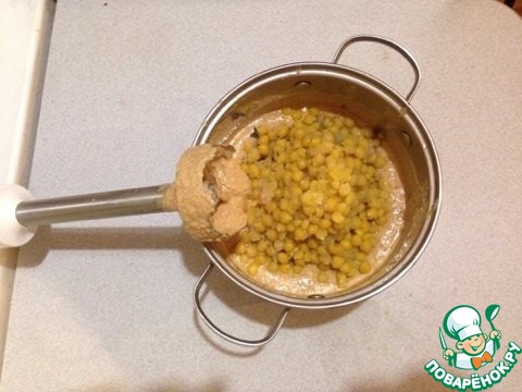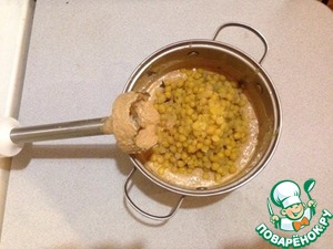 • Прямо в емкость с готовой тахинной пастой добавляем нут из сита, уже свободный от излишков жидкости..