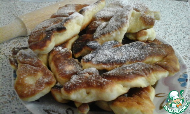 В каждом прямоугольнике сделать надрез в середине. Через середину вывернуть один край. Жарить таратушки в достаточном количестве растительного масла с двух сторон на хорошо разогретой сковороде. Готовые изделия посыпать сахарной пудрой.