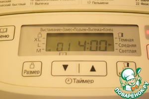 Выбираем программу "Основной хлеб" (если есть режим "Ржаной" -то его), размер - М (в моей ХП это на 400-500 г муки) и нажимаем кнопку "Старт".