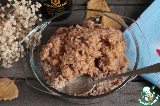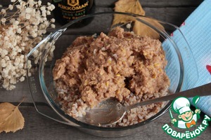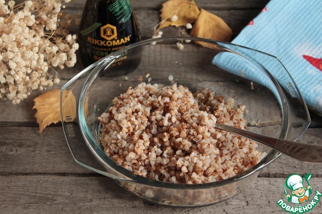 Если гречневая крупа набухла, но вода впиталась не вся, то ее необходимо слить. В набухшую гречневую крупу добавить приготовленное пюре. Снять пробу на количество соли. Если не достаточно, то добавить соевого соуса, только необходимо учитывать солоноватое тесто.