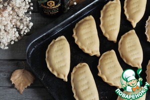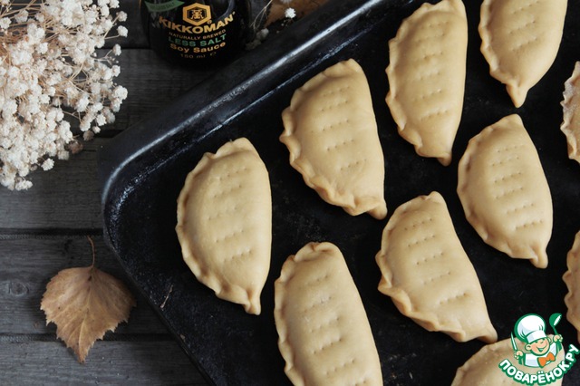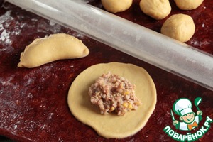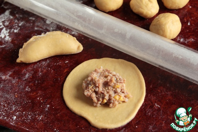 Разделить тесто на небольшие "колобки" размером чуть больше грецкого ореха (у меня получился 22 шт.). Тонко раскатать каждый "колобок", как тесто на лаваш. Выложить начинку, соединить края сочня в форме полукруга. Начинки класть много, но так, чтобы без труда соединить края сочня.
