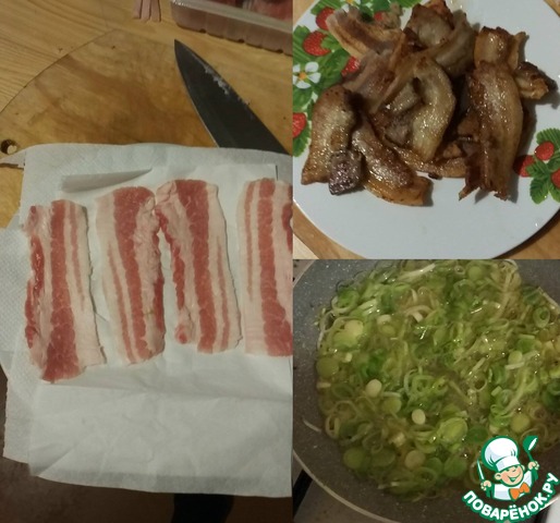 При подаче на кашу выкладываем лук и несколько ломтиков бекона.
