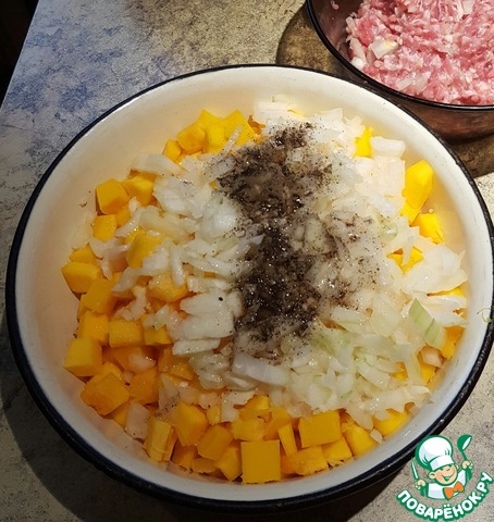 Нарезаем тыкву мелкими кубиками. Добавляем мелко нарезанный лук, соль, перец, масло и размешиваем.