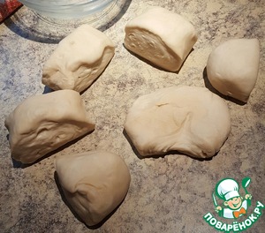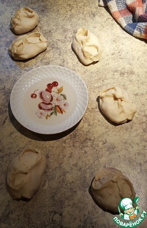 Тесто разрезаем на 5 равных частей. Это на 5 кругов- по 6 мантышек. У меня 6 получилось.
