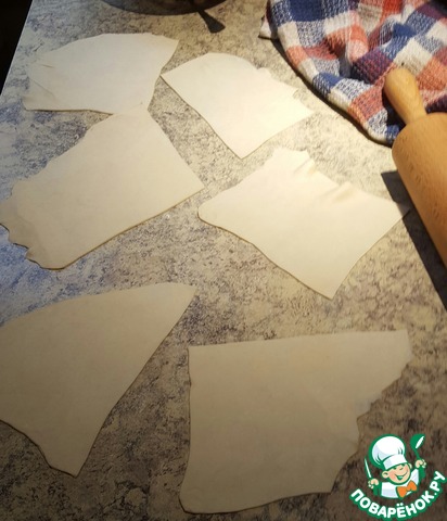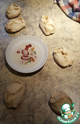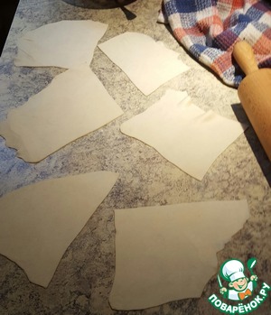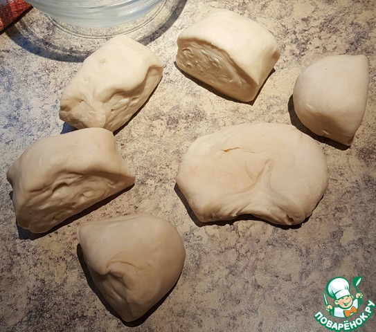 Тесто раскатываем и разрезаем на 6 шт. Тесто не липкое. Не добавляем ни масло ни муку. Расскатали одну сторону, перевернули расскатываем со второй стороны и так продолжаем. Всёвремя надо тесто переворачивать, тогда очень легко его расскатать. Это нюанс. Когда тесто расскатали и разрезали, надо каждый кусочек приподнять со стола, чтобы легче было лепить. Тоже нюанс.