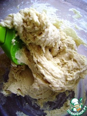 Всыпать мучную смесь в масляную и быстро, лопаточкой, замесить пластичное густое тесто. Убрать его в пакет и поместить в холодильник не менее, чем на 2 часа, а лучше еще больше. Я оставляла на ночь.