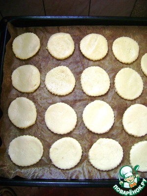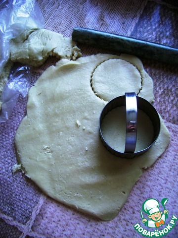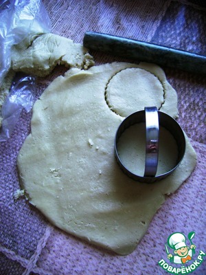 Разогреть духовку до 180 градусов. Раскатать тесто слоем примерно в один см и небольшой вырубкой вырезать четное количество кружочков.