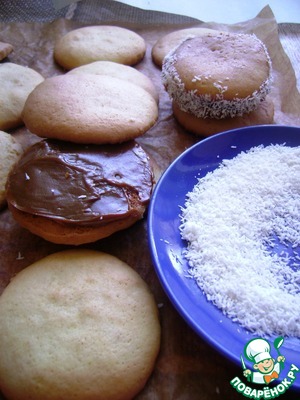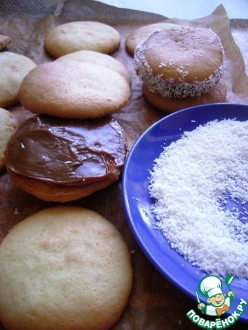 Остудить на листе до чуть теплого состояния и соединить попарно слоем вареной сгущенки, смазывая и края печенья. Прокатать края печенья в кокосовой стружке и дать пропитаться с часик