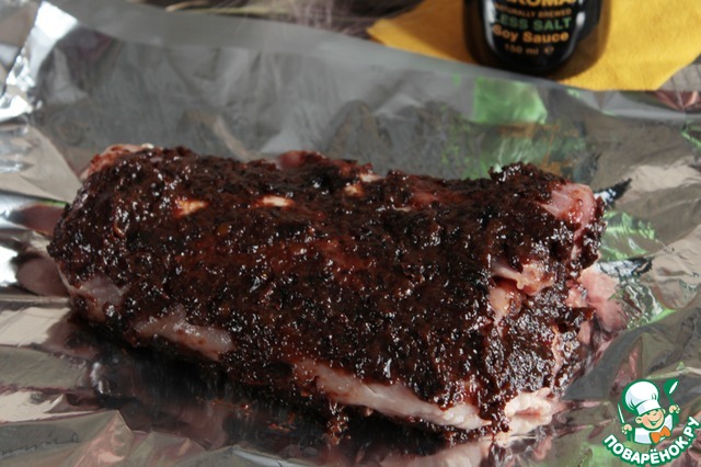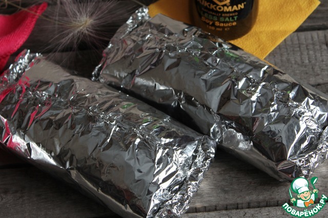 Плотно завернуть фольгу сверху и с торцов. Запекать на решетке в предварительно разогретой духовке. Под решетку поставить противень на случай, если все-таки мясной сок протечет через фольгу. Сначала запекать мясо в фольге. Затем раскрыть фольгу, слить образовавшийся сок и запечь в раскрытом виде со всех сторон до полной готовности. В своей духовке я запекала 1 час в закрытой фольге и по 30 минут сверху и снизу в развернутом виде.