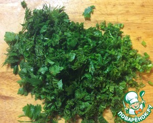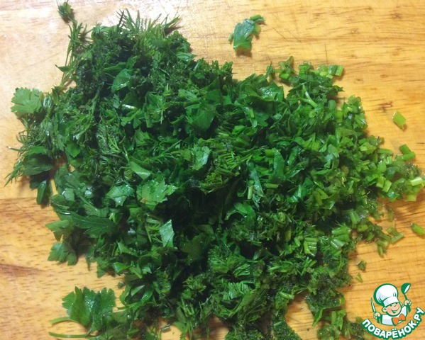 Укроп и петрушку вымыть и мелко нарезать. Для получения насыщенного вкуса салата зелени нужно брать довольно много, чтобы она отчетливо ощущалась. Соотношение укропа и петрушки 1:1.