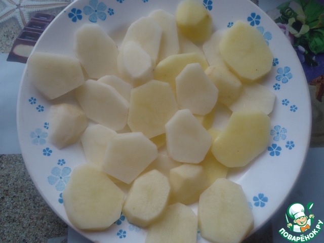 Картофель нарезать тонкими кружочками, толщиной не более 5 мм.