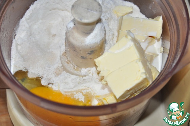 Для приготовления берём из холодильника сливочное масло, сливки, яйцо. Добавляем сахар, соль, муку. Всё перетираем руками в крошку, замешиваем эластичное тесто. Для меня удобнее перемешивать с помощью кухонного процессора.