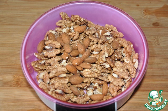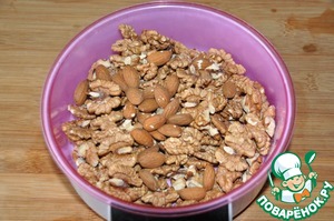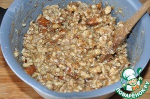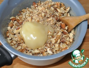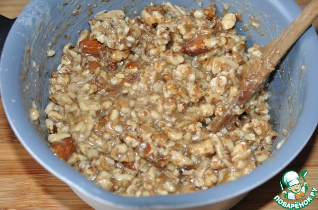 Добавляем орехи в готовую карамель, туда же кладём полную ложку мёда.