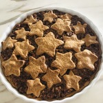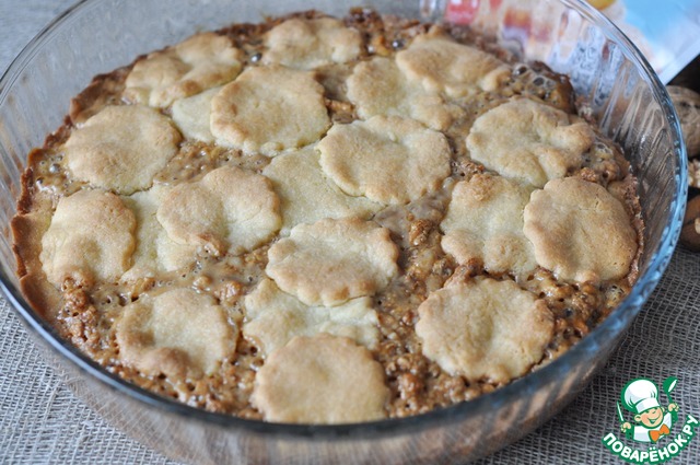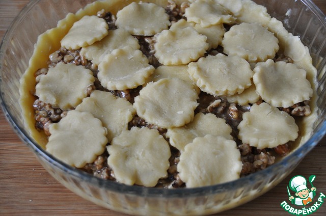 Достаём из холодильника вторую часть теста. Её можно раскатать и полностью закрыть начинку. А можно вырезать лепёшки из теста и плотно положить сверху на начинку.