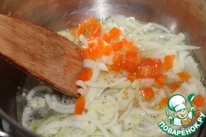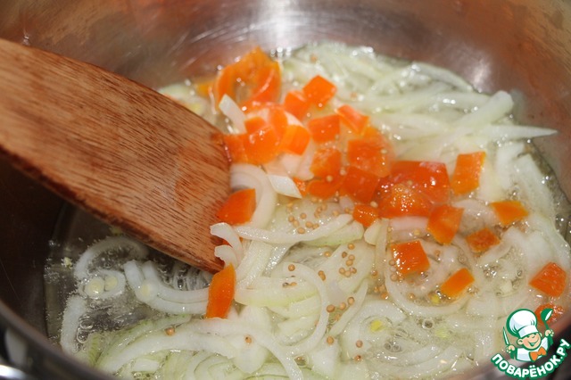 • Добавить болгарский перец, освобожденный от семян и перегородок и порезанный кубиками. Добавить семена горчицы. Обжаривать еще 5 минут.