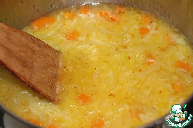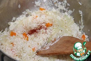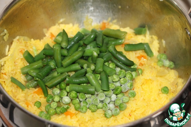 • Добавить рис и чеснок, интенсивно помешивая, готовить 2 минуты, рисинки должный покрыться маслом. Затем добавить нити шафрана,