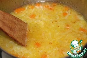 • В кастрюле с толстым дном разогреть растительное масло, на небольшом огне обжарить лук 5 минут, до прозрачности.