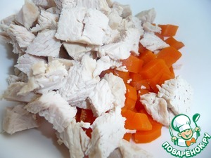 В кипящую воду 500мл положить мясо, морковь, лук. Варить 40мин. За 5мин до готовности добавить лавровый лист, перец, соль.