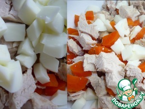 Предлагаю рецепт диетического заливного мяса из индейки. Насыщенное желе, приятная кислинка красной смородины, сладость моркови и нежный вкус горошка прекрасно сочетаются с отварным мясом. Такое заливное украсит любой праздничный стол. Вместо индейки можно использовать говядину или куриное мясо. Овощи использовать те, что вам нравятся. Бульон нужно варить на очень маленьком огне, тогда он будет прозрачным. Я заливала в порционные силиконовые формочки, очень удобно, легко выскакивают. Можно использовать и одну большую форму.