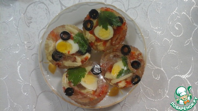 В формочки (у меня силиконовые для маффинов) выложить смородину (я ее не размораживала), горошек (согрела в микроволновке 30сек.) и зелень. Сверху выложить мясо с белками и морковью.