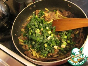 Положить фасоль, через пару минут зеленый лук (тут меня подвел фотоаппарат, села батарея, взяла другой, качество не очень), тушим все минут 5, затем вливаем остатки соевого соуса и тушим при интенсивном помешивании еще минуты 2-3.