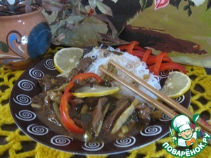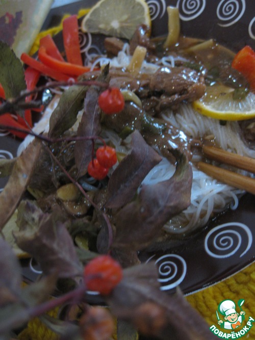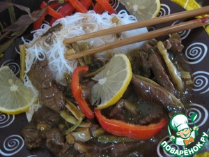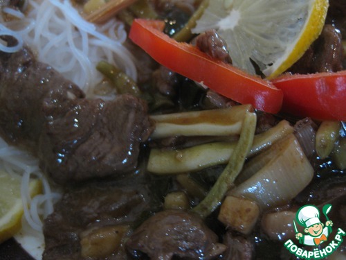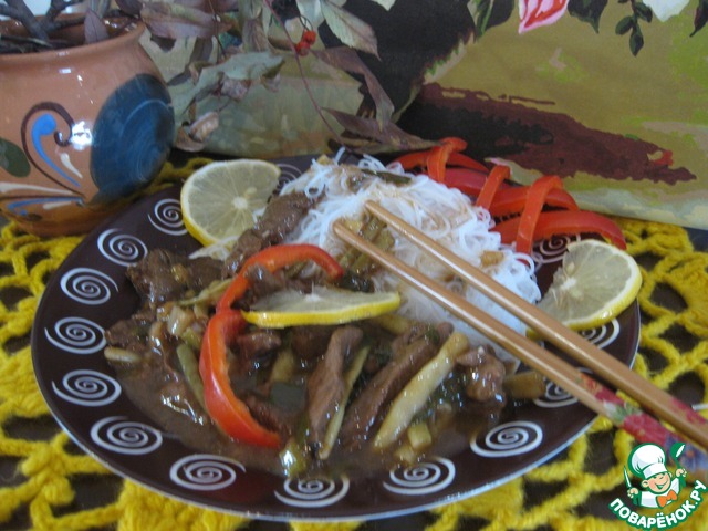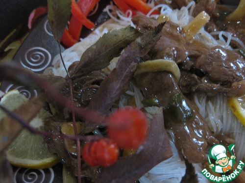 Подать поджарку с фунчозой или рисовой лапшой, украсив дольками лимона и красного перца (по желанию)