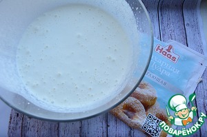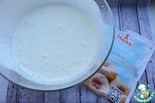 35% жирности сливки взбить с сахарной пудрой, масса станет густой, но сохранит воздушность. Добавить в нее остывшую желтково-молочную смесь. Все перемешать.