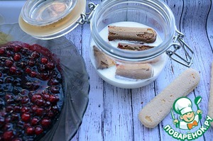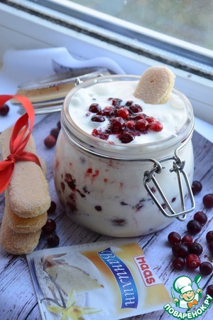Вниз наливаем немного крема, Савоярде разламываем, окунаем в клюкву, выкладываем на крем, сверху пару ложек клюквы, затем опять крем и так до самого верха.