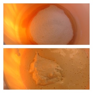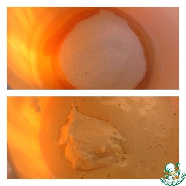 Яйца взбить с сахаром и ванилином в пену. Добавить мягкий творог (творожную массу можно), и взбить еще пару минут.