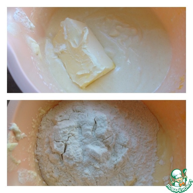 Добавить мягкое ( комнатной температуры) масло, взбить минутку. Всыпать разрыхлитель и муку. Взбить пару секунд не больше.