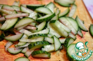 Свеклу и огурец нарезать тонкими полосочками, шалот полукольцами, яйца мелко порубить.