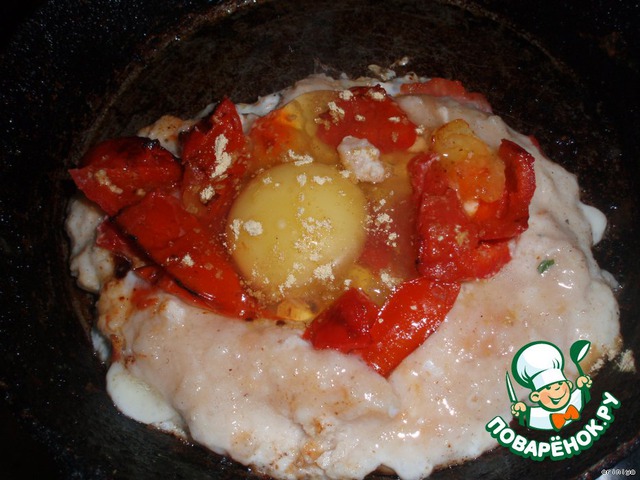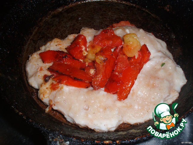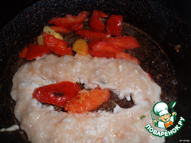 На сковородку выложить фарш, рядом обжарить перец, помидоры