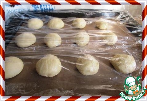 Накрываем противень пищевой пленкой и оставляем в теплом месте часа на полтора.