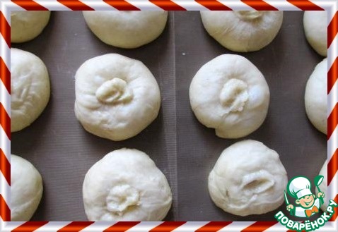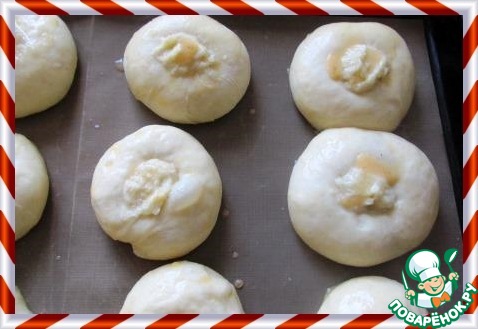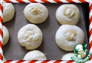В подошедших заготовках для булочек делаем пальчиком глубокую ямку и выкладываем туда 1/2 ч. л. начинки