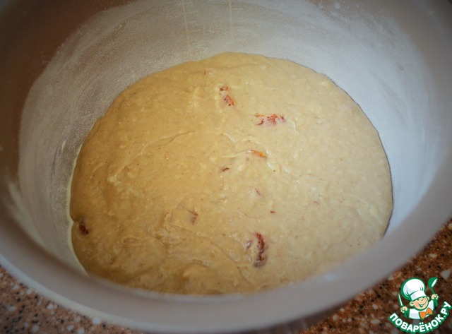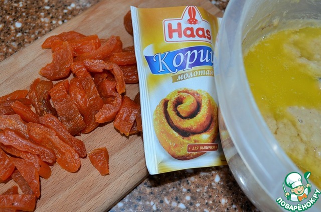 Курагу нарезать. У Андрея пирог с черносливом, так что можно использовать сухофрукты по Вашему вкусу. Курагу вмешать в тесто.