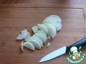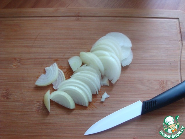 Берём сотейник или сковороду с толстым дном. Наливаем масло и в разогретое выкладываем лук, порезанный полу-кольцами. Золотим его пару минут.