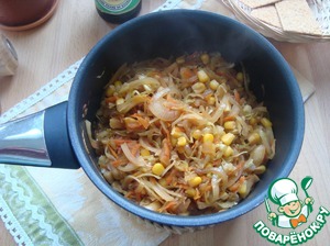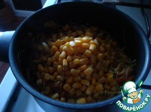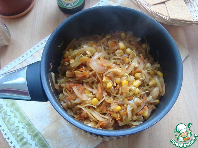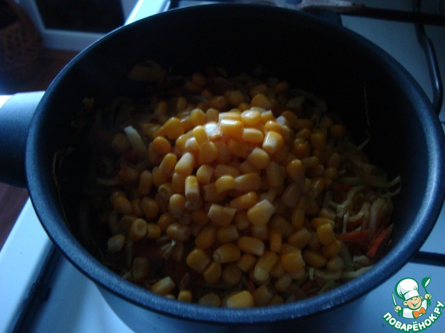 Открываем баночку кукурузы и ложкой выкладываем к капусте вместе с жидкостью. Вы можете посолить, если вам не хватает соли и для любителей поострей, можно добавить жгучий перец красный. Я этого не сделала. Мне хватает одного соевого соуса.