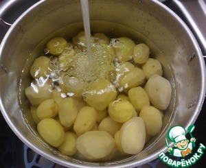 Картошку, после того, как сварилась, мнем в той же воде. Аккуратно, чтобы не обжечься паром