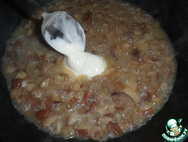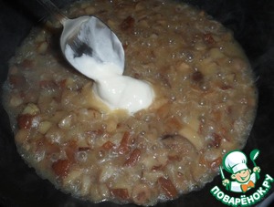 После того, как грибы прожарились (у меня обычно минут 20 после размораживания), добавляем сметану и на минимальный огонь для тушения еще минут на 10