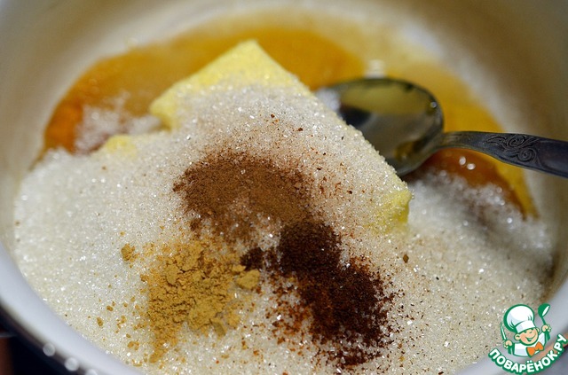 Растопите на водяной бане мед с сахаром и маслом, смешайте с содой и пряной смесью.