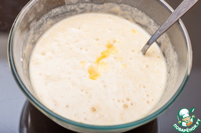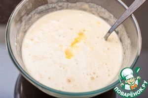 Добавить остатки сливочного масла, еще раз перемешать и оставить тесто на 10-15 минут, чтобы кукурузная мука набухла. Тесто получается не очень густое, поэтому оладьи получаются невысокие. Если добавить муки, можно добиться пышных красивых оладий, но они станут не такими мягкими и нежными.