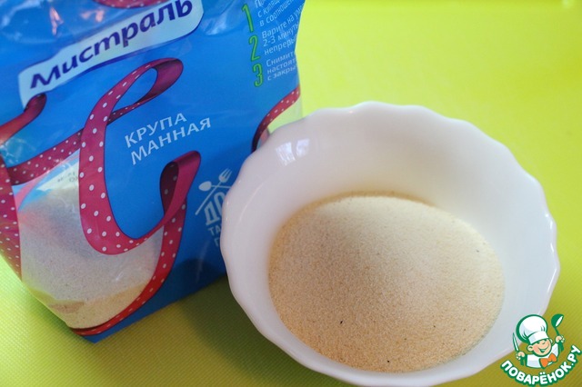 Разъемную форму для выпечки (диаметр 25 см) смазать сливочным маслом, присыпать манной крупой, излишки манки стряхнуть.