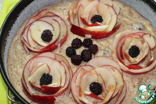 Выложить тесто в форму, сформировать из яблочных «лент» подобие цветочком, в середину положить ягодку ежевики..